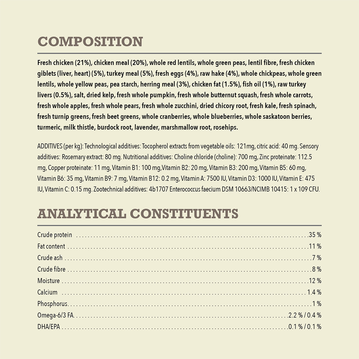Fresh chicken (21%), chicken meal (20%), whole red lentils, whole green peas, lentil fibre, fresh chicken giblets (liver, heart) (5%), turkey meal (5%), fresh eggs (4%), raw hake (4%), whole chickpeas, whole green lentils, whole yellow peas, pea starch, herring meal (3%), chicken fat (1.5%), fish oil (1%), raw turkey livers (0.5%), salt, dried kelp, fresh whole pumpkin, fresh whole butternut squash, fresh whole carrots, fresh whole apples, fresh whole pears, fresh whole zucchini, dried chicory root, fresh kale, fresh spinach, fresh turnip greens, fresh beet greens, whole cranberries, whole blueberries, whole saskatoon berries, turmeric, milk thistle, burdock root, lavender, marshmallow root, rosehips.